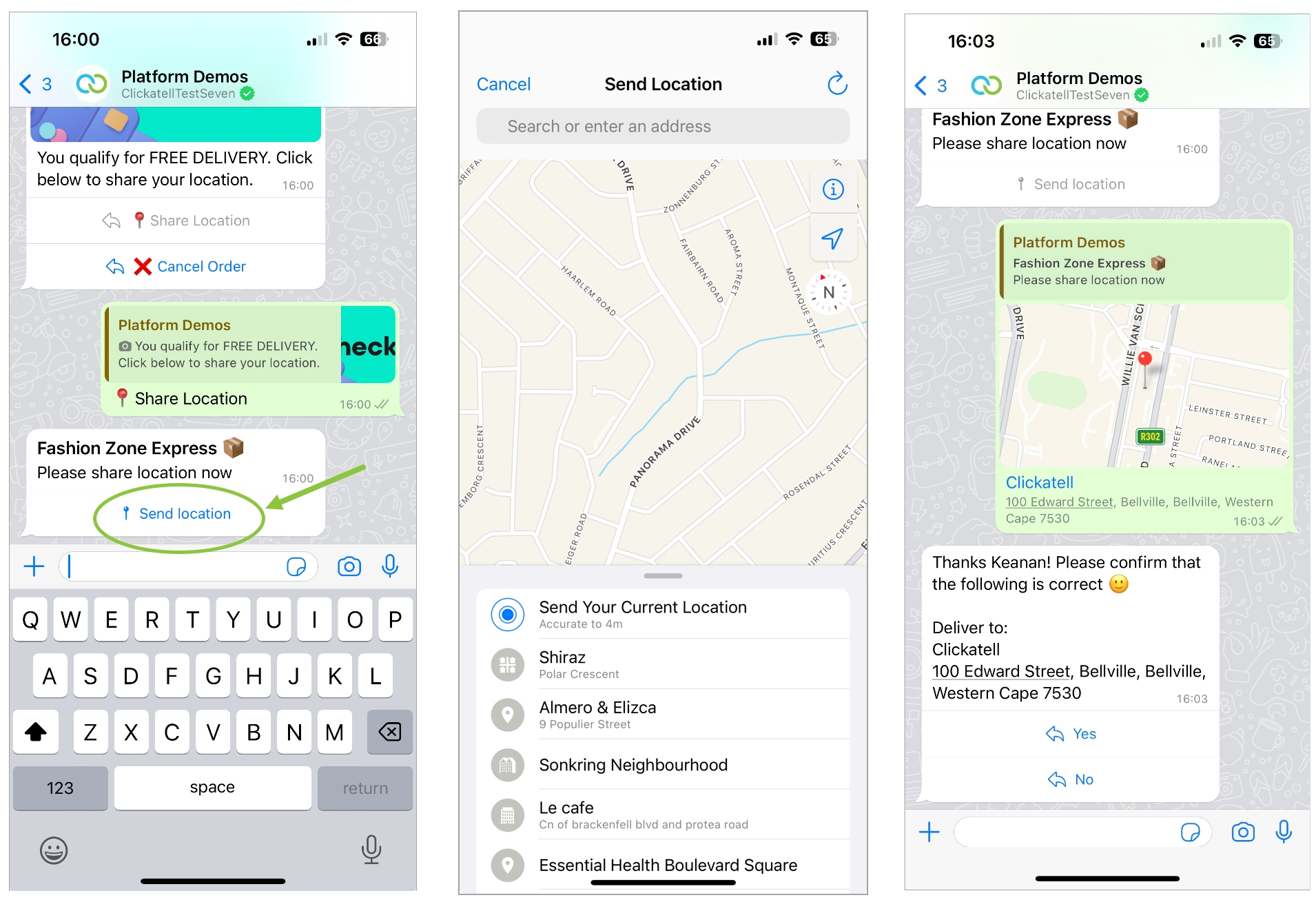 Below is an example of what the customer sees in WhatsApp when chatting with your business. The customer is asked to share their location with the business, which they can easily do by tapping the Send location button. The business can then utilize this information in their workflows.