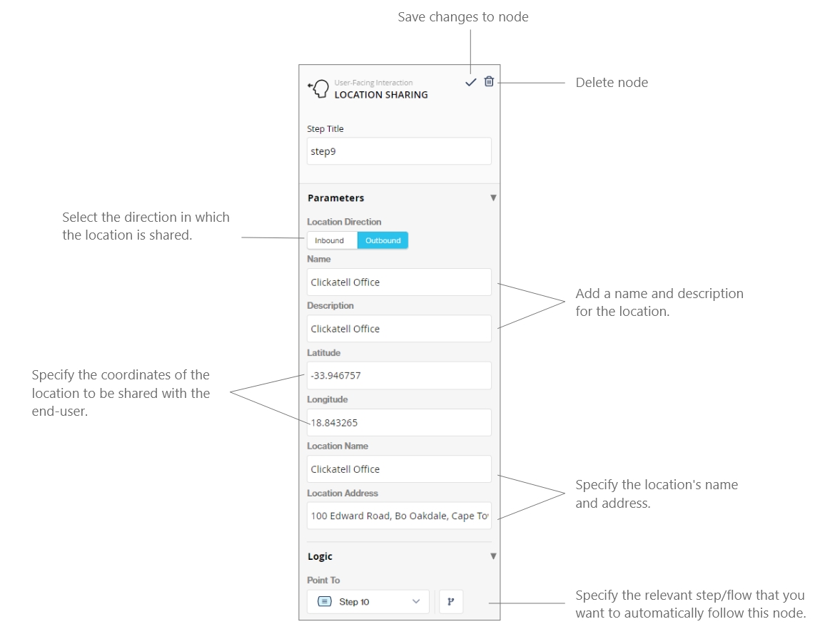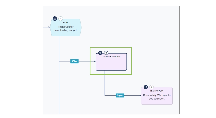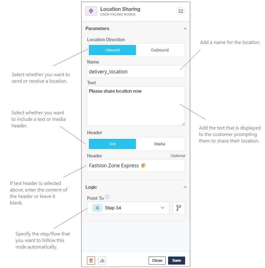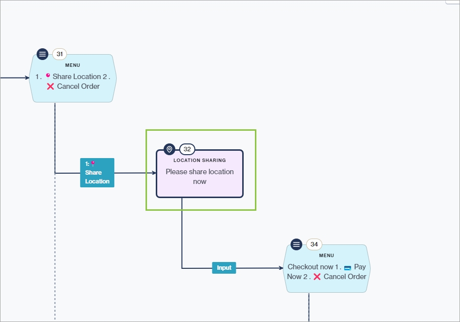 Use the Location Sharing node to either send a location pin to a customer OR receive a location pin from the customer and use the latitude, longitude, location name, and address within your flow.