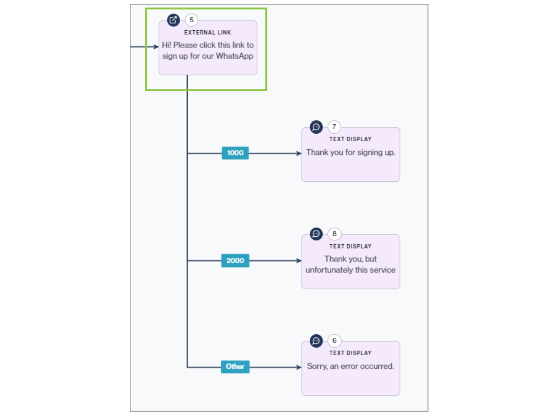 The External Link node allows you to call an external web URL and in turn allows the URL to return a single variable result. Your customer is directed to an external web page from within a Chat Flow conversation and then returns to the Chat Flow conversation with (optionally) additional data gathered from the external web page.