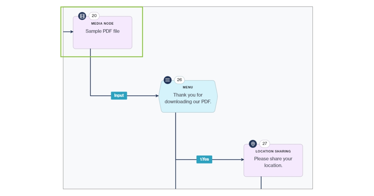 Use the Media node to send or receive media files supported by the channels you have set up in Chat Flow.