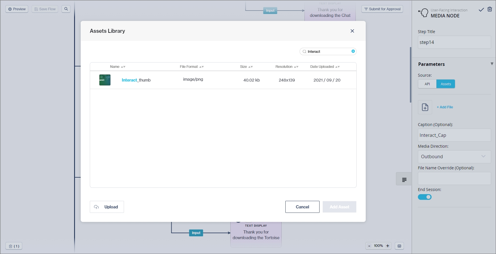 Selecting this option opens another call to action, + Add file. Clicking this opens a pop-up modal where the flow-builder can add new media files, or select from previously uploaded ones. After selecting +Add File on the node, you can upload a new media file or select from existing ones.