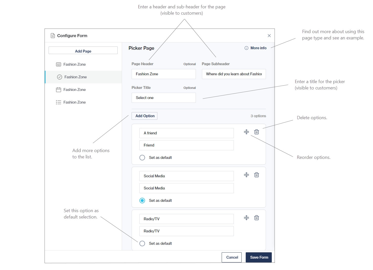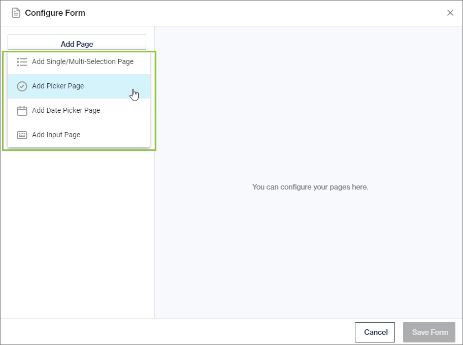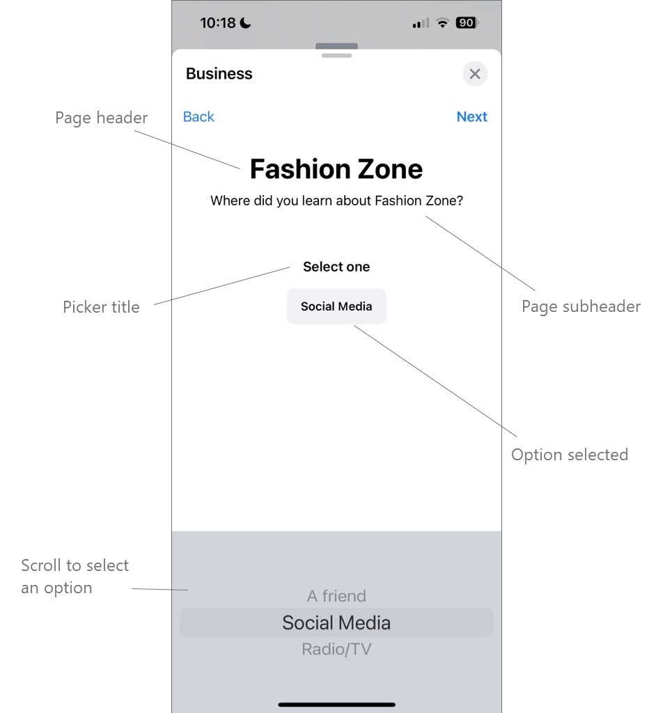 Use the Date Picker page to ask customers to select a day, month, and year within a set date range.