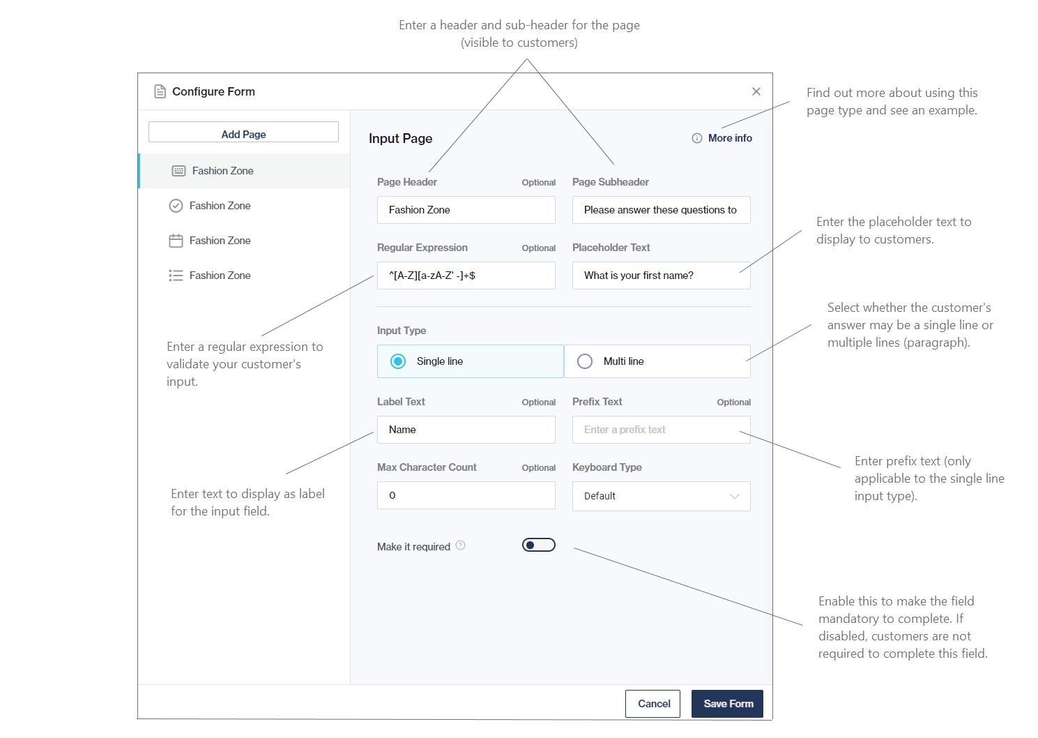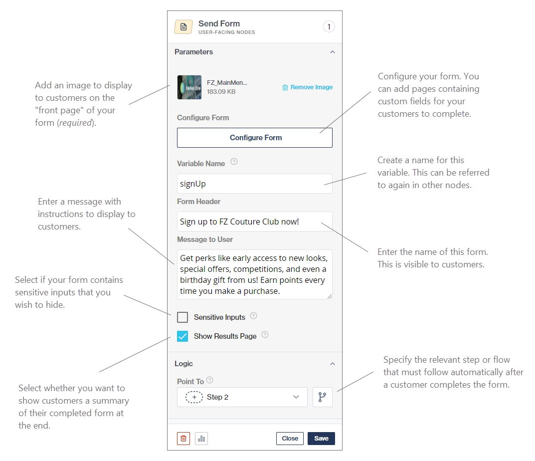 With the Send Form node, you can create rich, multipage interactive forms for customers to complete on their mobile devices.