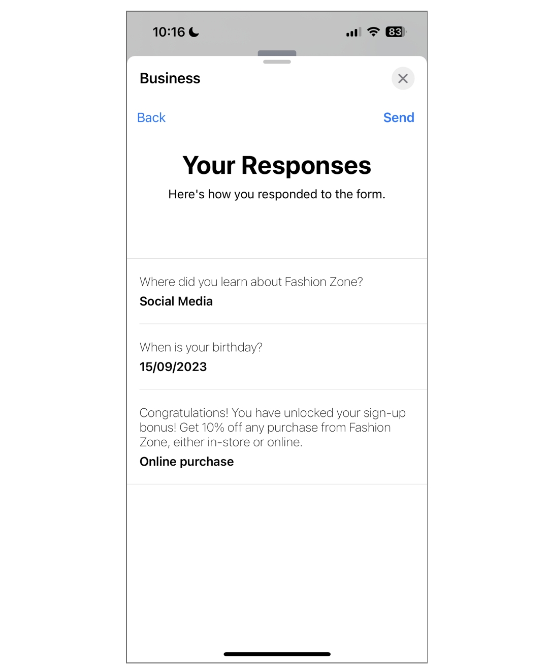 If you've selected the "Show Results Page" option when configuring the node (see above), a summary of the customer's responses is shown to them upon completing the form. They have the option to send the form if they are happy with their responses, or to step back and amend their answers if they wish.