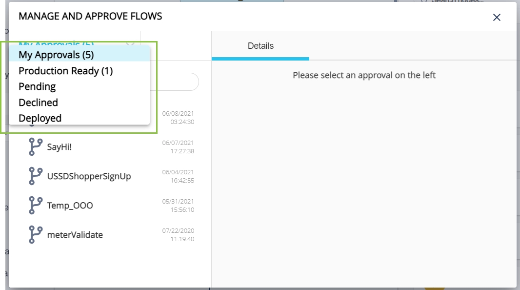 My Approvals - only visible to users allowed to approve workflows; contains all flows that are waiting to be approved
