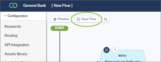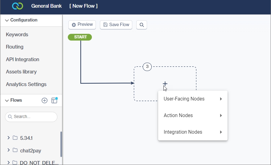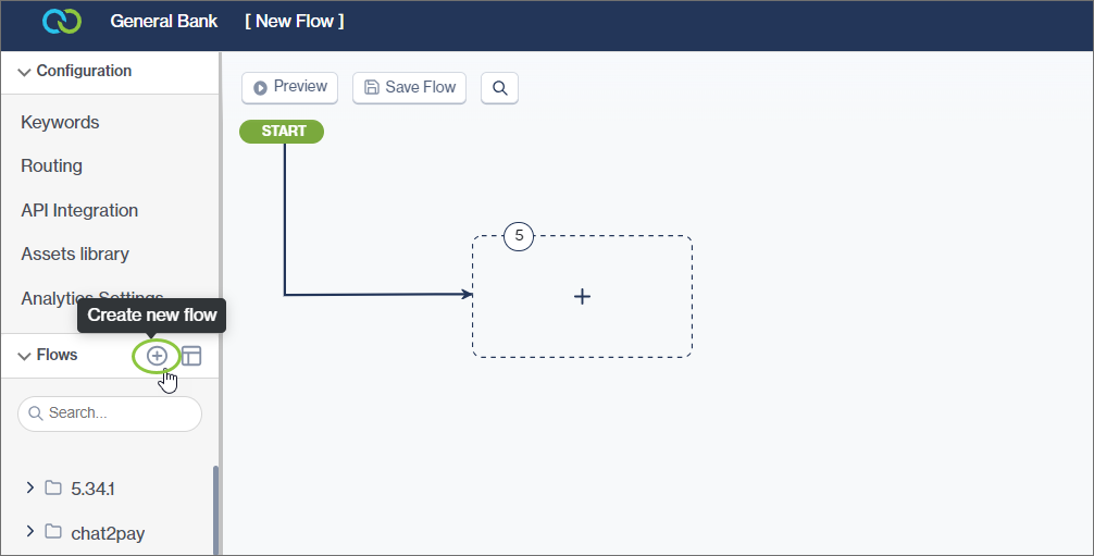Select + Create New Flow from the panel on the left. A flow called [New Flow] appears at the top of your list of flows. A Start node and arrow will automatically appear on your canvas as the starting point for your flow.