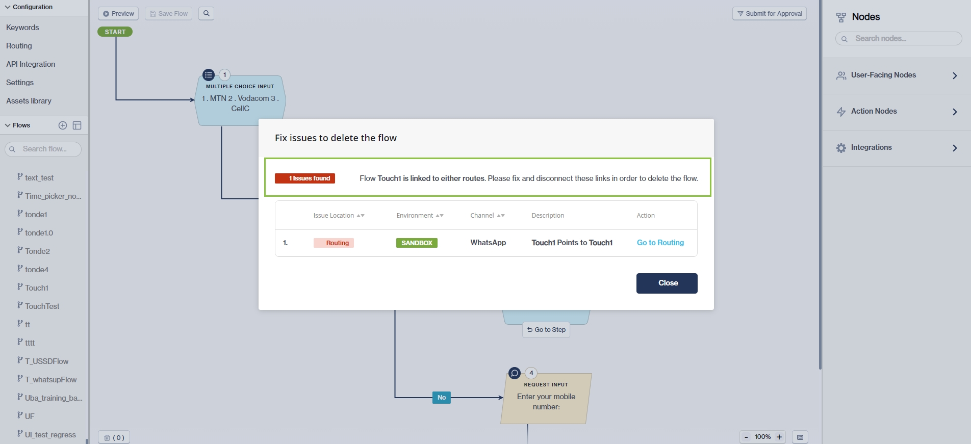 If the flow is linked to other flows, routes, or keywords, you have to disconnect the linked flow/route/keyword before you can delete the flow.