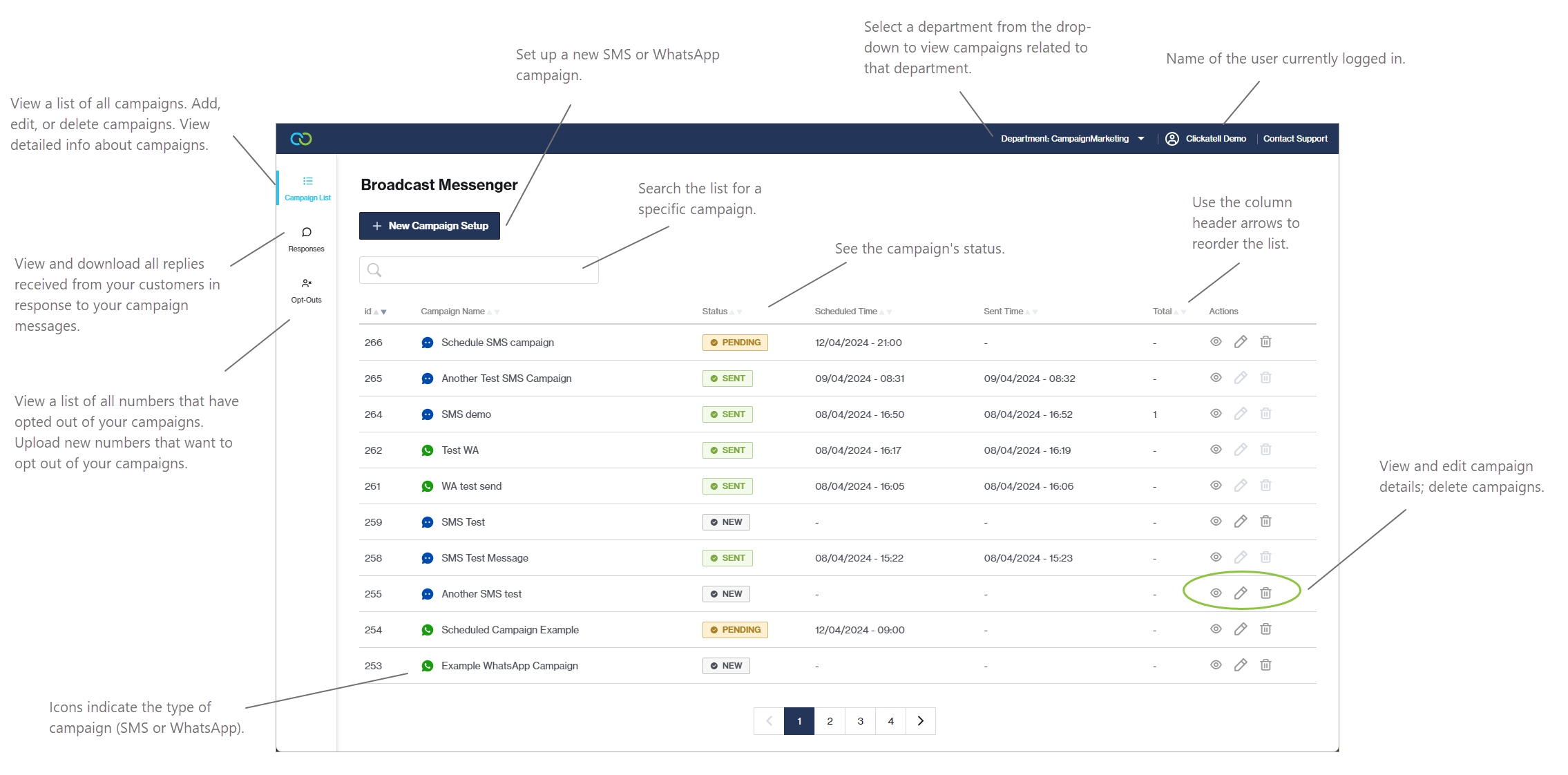 Clickatell's Broadcast Messenger tool lets you create and manage marketing campaigns and send bulk WhatsApp and SMS messages to lists of recipients.
