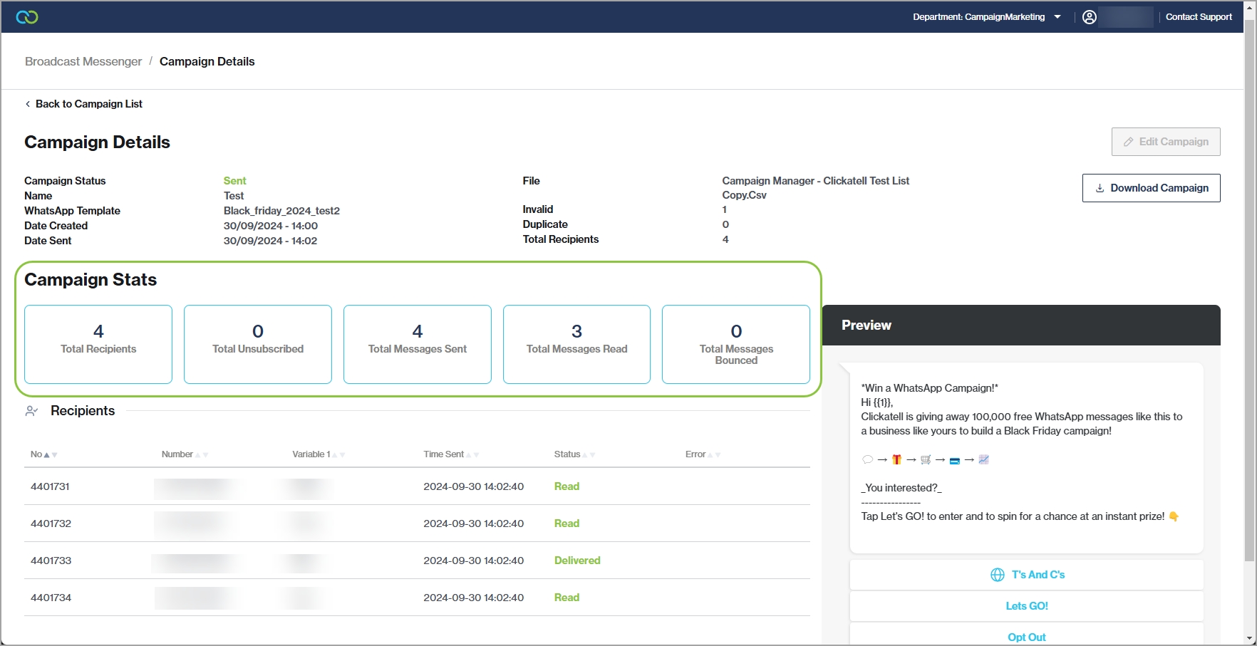 You'll see summary information about the campaign at the top, and a preview of the campaign message to the right.