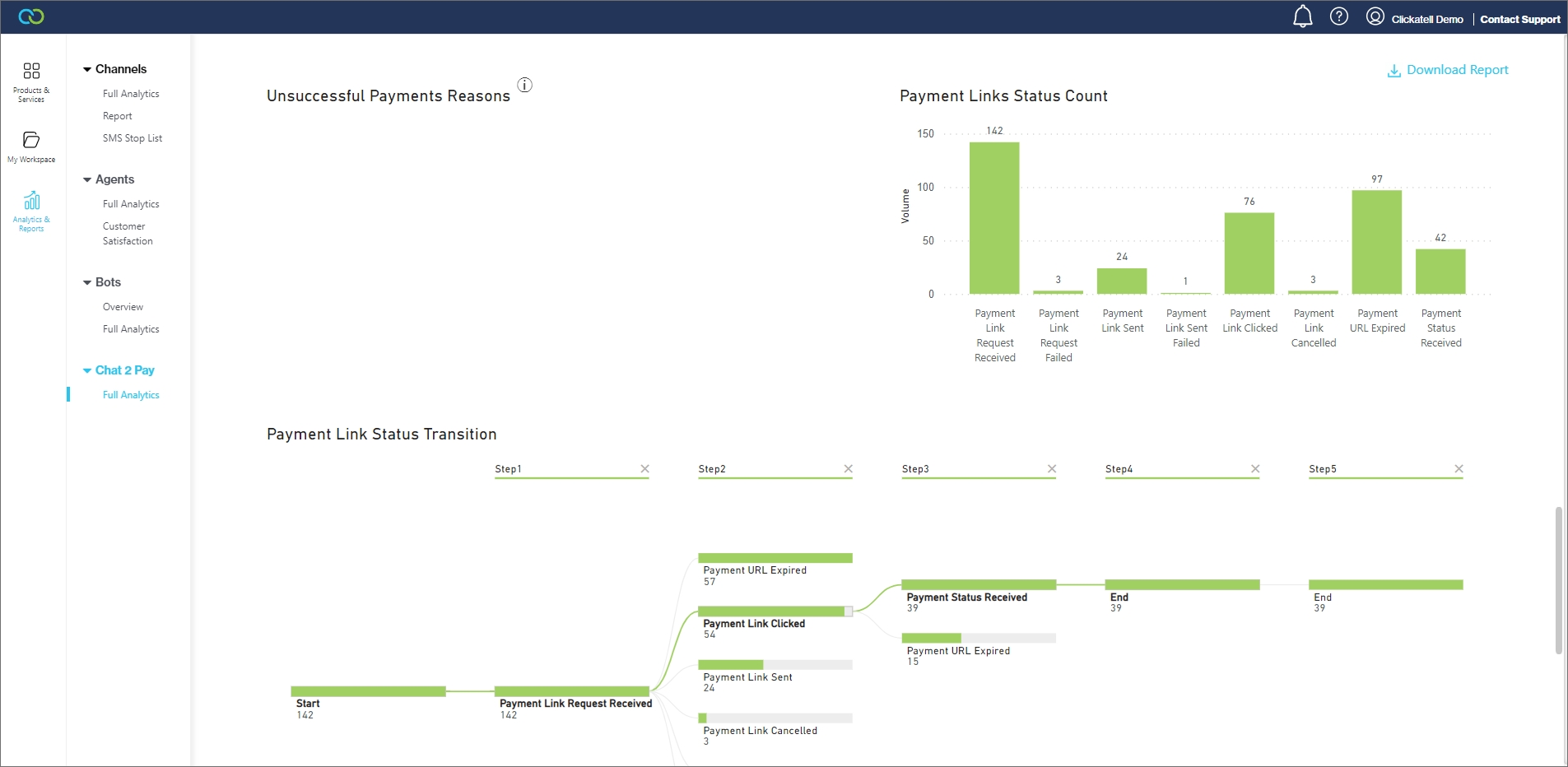 You get access to the following Chat 2 Pay reports in the Clickatell Portal:
