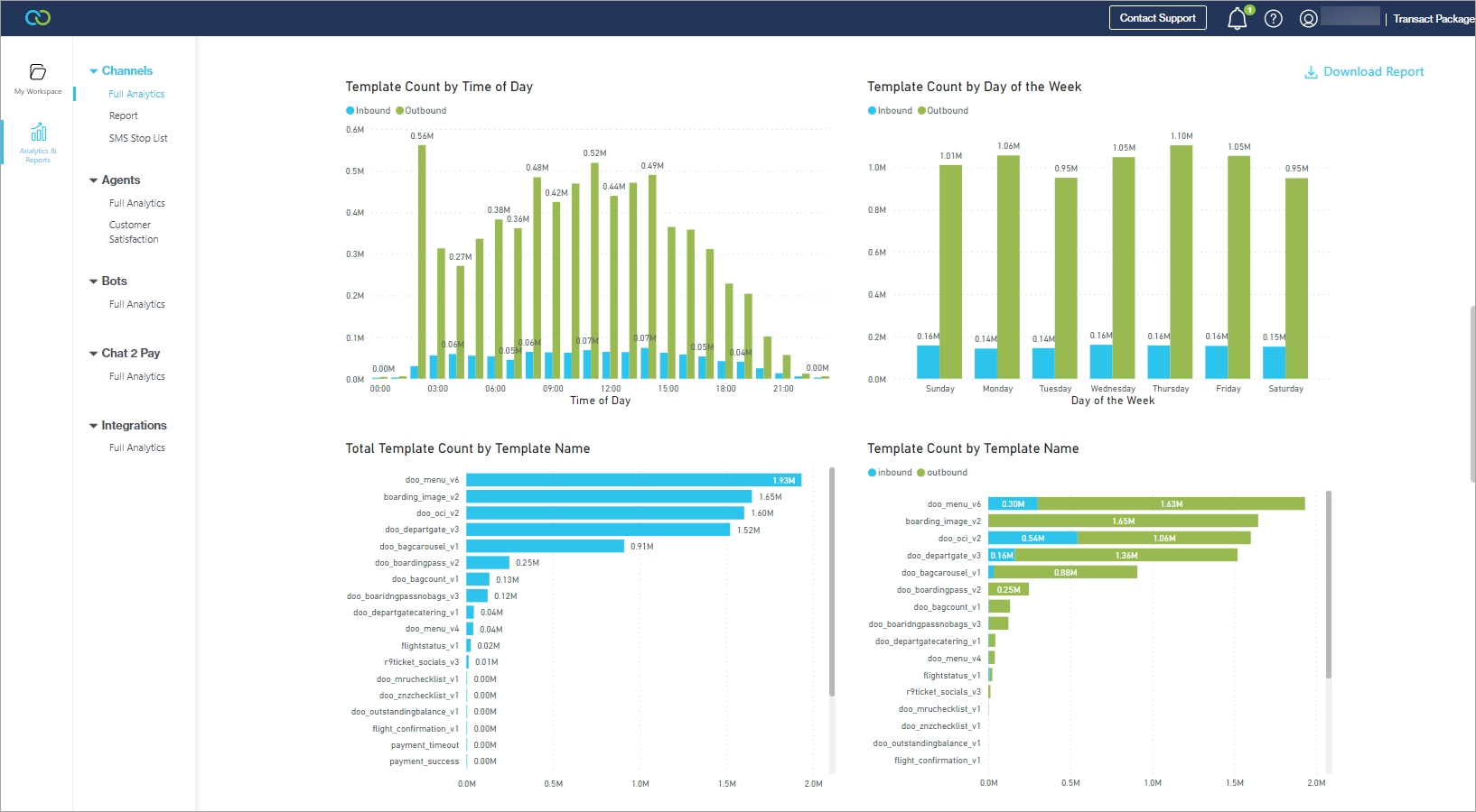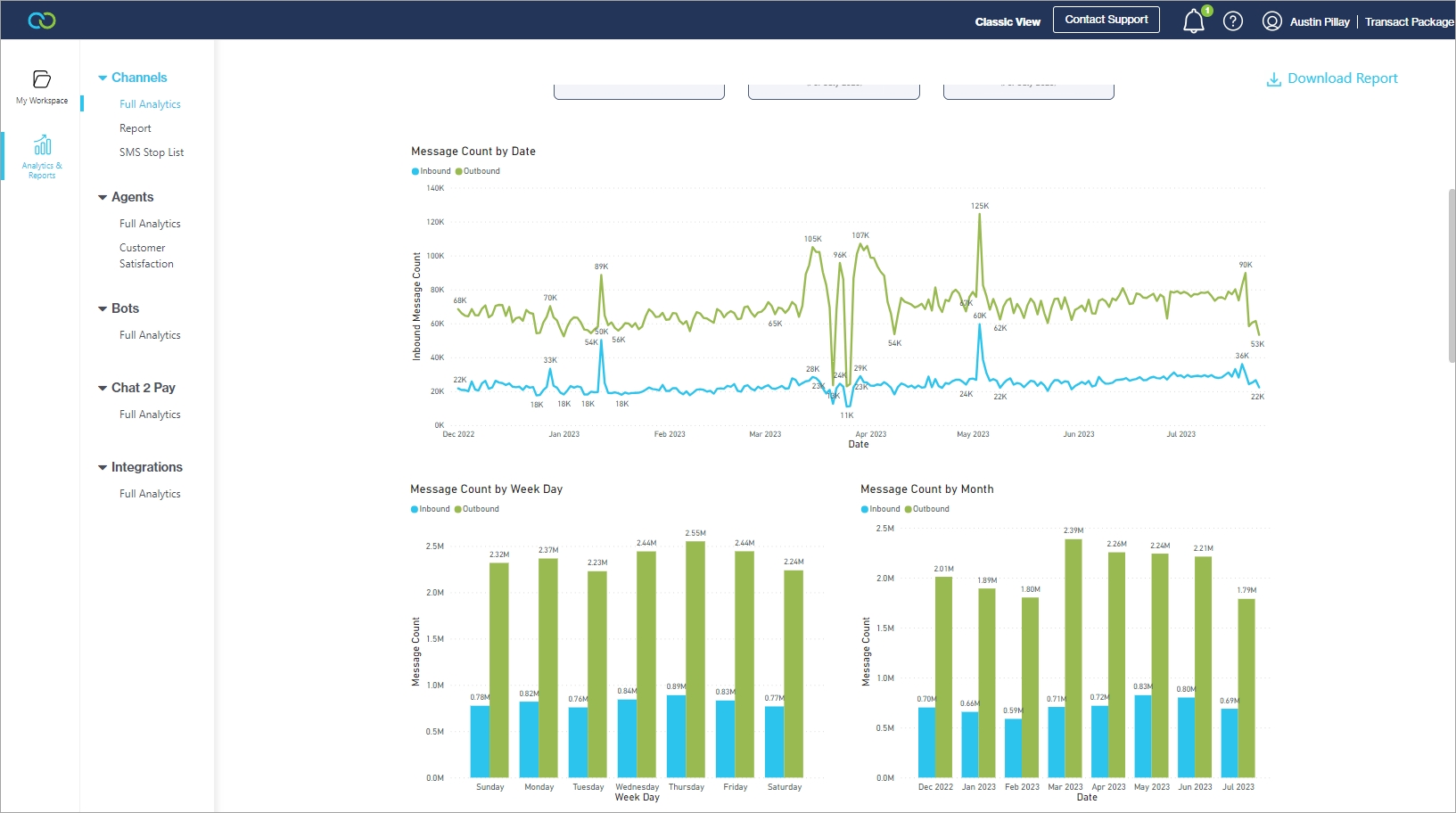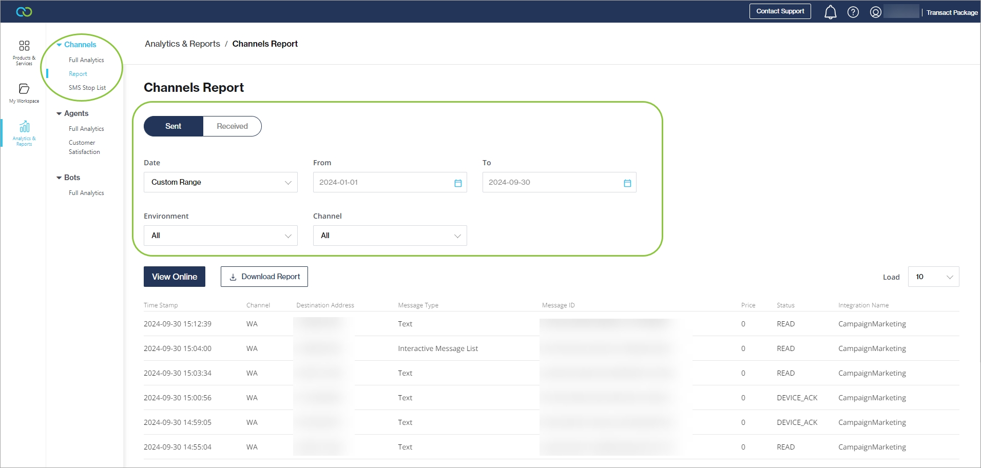 Create, view, and download (PDF) custom reports based on your channel activity. This can be done for sent and received messages respectively.