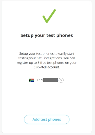 To test the sending and/or receiving of messages from the Sandbox environment, you can add up to three test phone numbers to your account. Click on the ‘Add test phones’ button and follow the prompts. Note that phone numbers must be entered in international format and must contain no spaces or other non-numeric characters. You can also add test phones by navigating to ‘SMS → Test phones‘ from the panel on the left, or simply clicking the ‘Add a Test Phone‘ button from your Launchpad. Once at least one test phone has been set up, you can test your API.