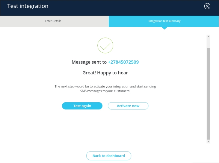 Navigate to ‘SMS → Configure SMS’. At the bottom of your page is a table listing your SMS integrations. Click on the ‘Activate now‘ button next to the API you want to move from Sandbox to Production. This will run you through a wizard so you can confirm the API details and update it if necessary. Clicking ‘Finish‘ will activate your API on Production.