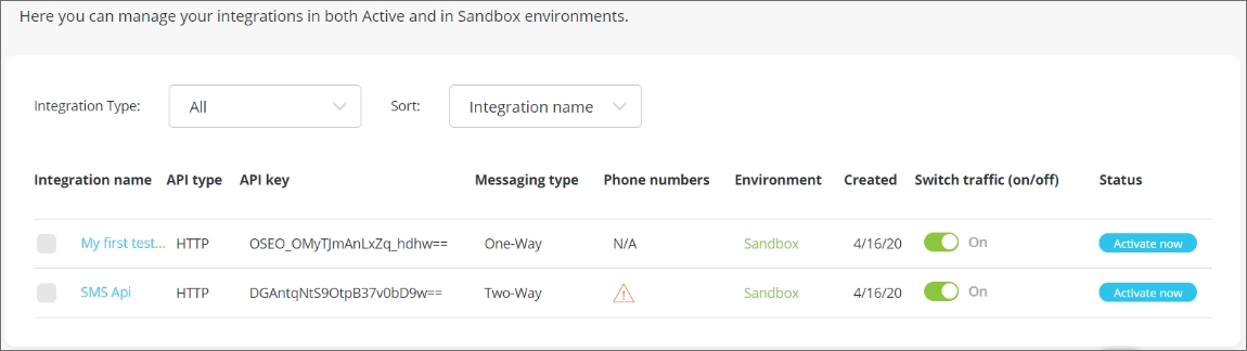 If two-way messaging was selected, you have to purchase a long number or short code in order to receive replies to your messages. Your integration will remain in the Sandbox environment until your long number or short code has been activated. See Step 3 below on how to acquire a short code / long number.