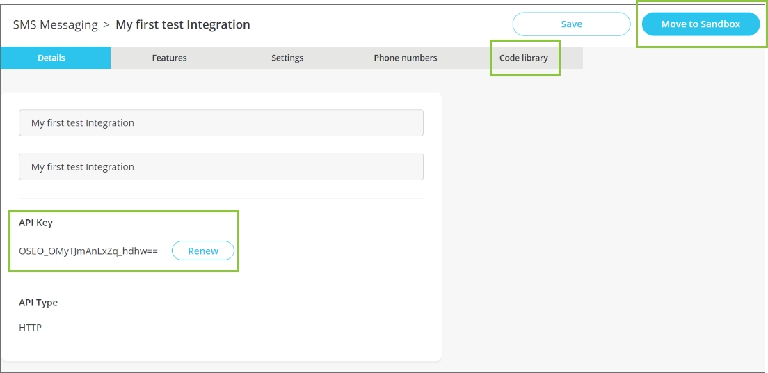 To view and edit the details of your API, navigate to ‘SMS → Configure SMS’. Click on the relevant API from the table at the bottom of your page. From here you will be able to update any of your API details or move the API integration back into the Sandbox. You can also view the API Key and renew it if it was compromised. It gives you access to the code library of your integration with an example. To send your first message, you can simply copy this example URL directly into your web browser replacing the text message with your own. The server will respond with a unique identifier for each message (referred to as an API Message ID). This API Message ID can be used to track and monitor the status of your message.