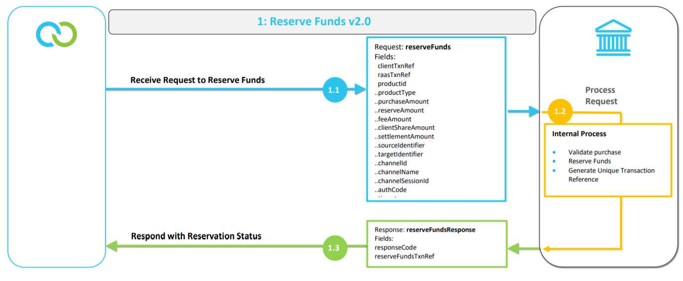 The Reserve Funds API is the first point of communication between Clickatell and the bank where Clickatell requests the reservation of funds for a purchase from the client, and the bank replies with the outcome of this reservation.