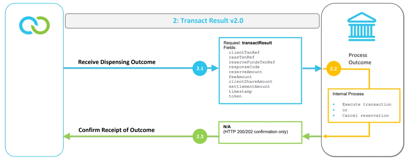 The Transact Result API is the second point of interaction between Clickatell and the bank where Clickatell confirms the outcome of dispensing the product with the bank, and the bank can either proceed with the payment or cancel the fund reservation.