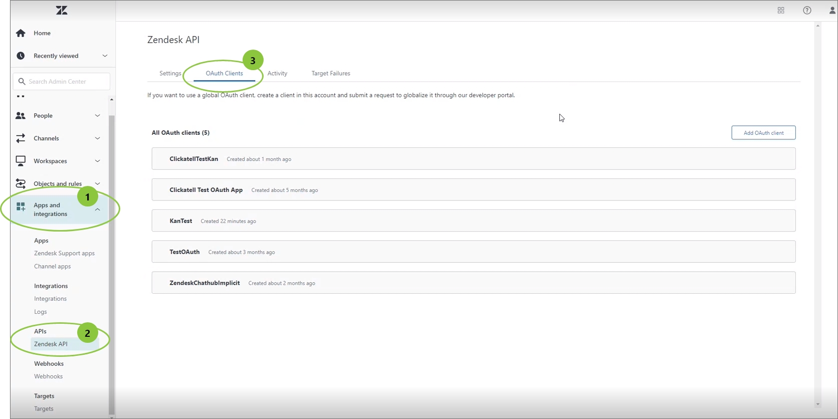 Go to Apps and Integrations -> Zendesk API -> OAuth Clients.
