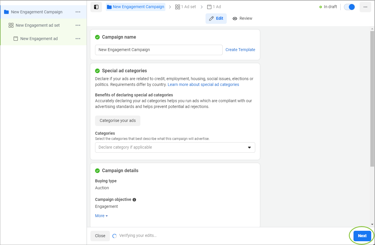 View/edit the Campaign Name and Campaign Details. If appropriate, you can declare your WhatsApp Ad as a Special Ad or set up an A/B test. Click Next.
