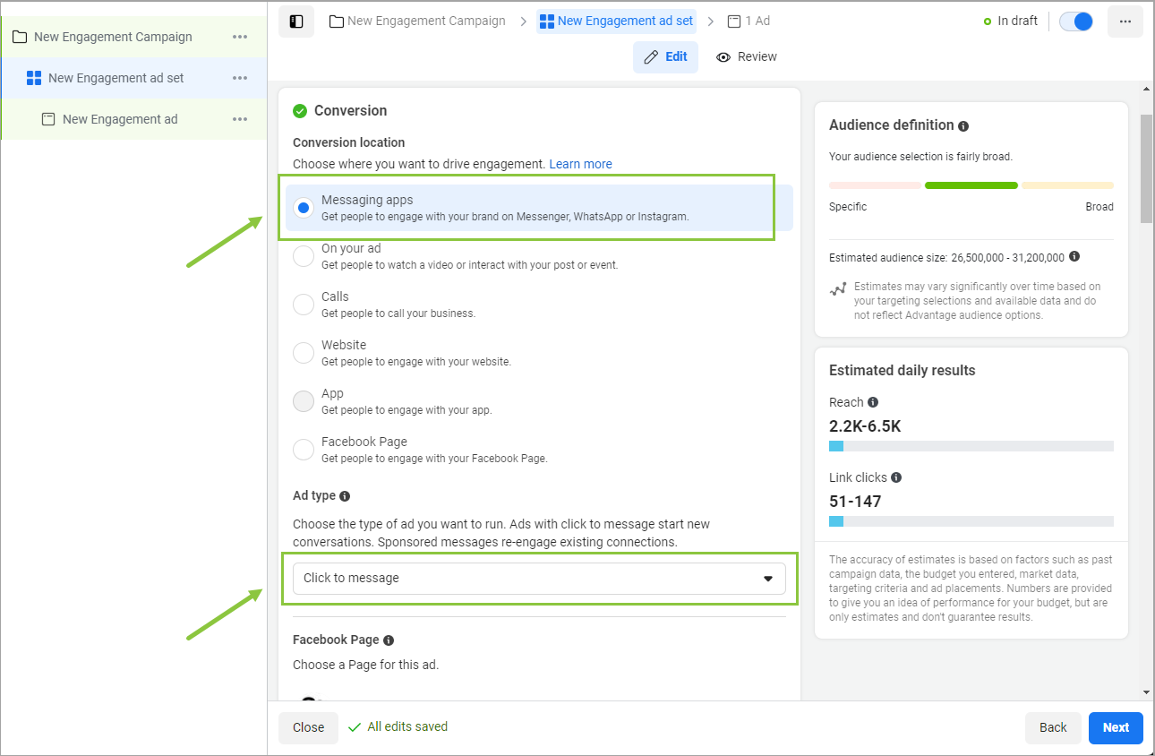 In the Conversion section select "Messaging apps" and under Ad type, select "Click to message".