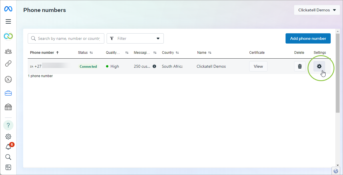 Select the gear icon in the Settings column next to the number for which you want to add the conversational component.