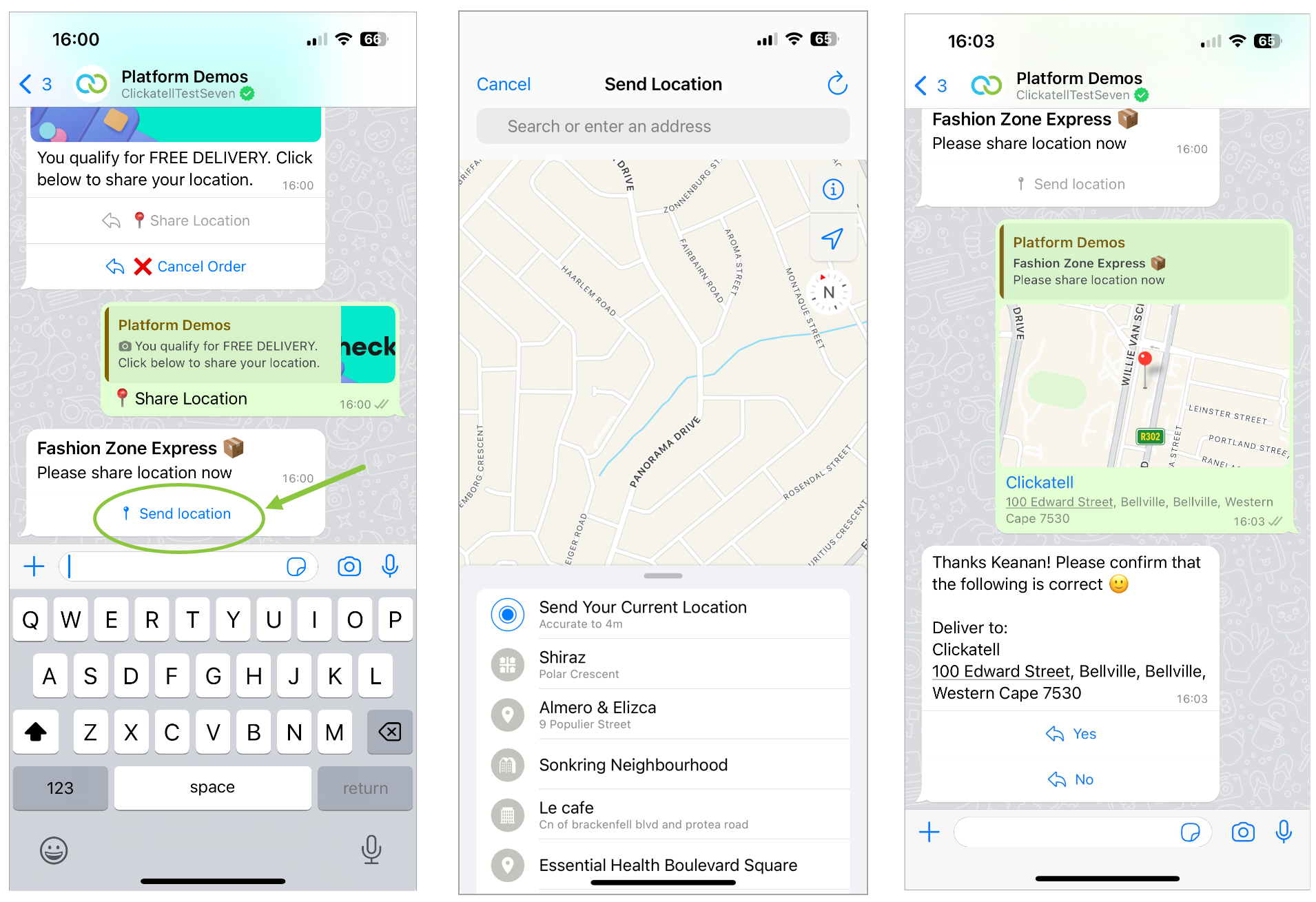 These messages request your customer's location. They contain body text and a Send location button that customers can tap. Tapping the button displays a location-sharing screen that the user can then use to share their location.