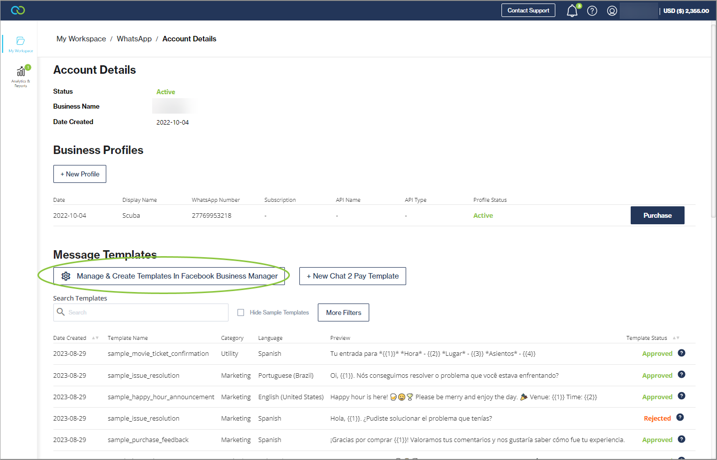 Navigate to My Workspace --> WhatsApp and select a WhatsApp account from the table.