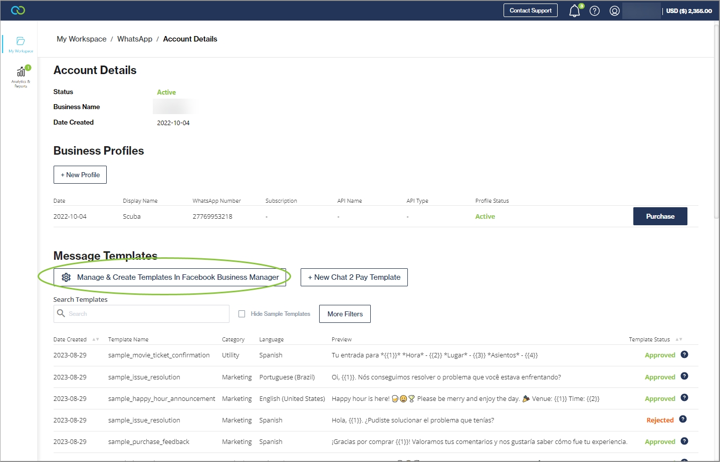 Navigate to My Workspace -> WhatsApp and select a WhatsApp account from the table.