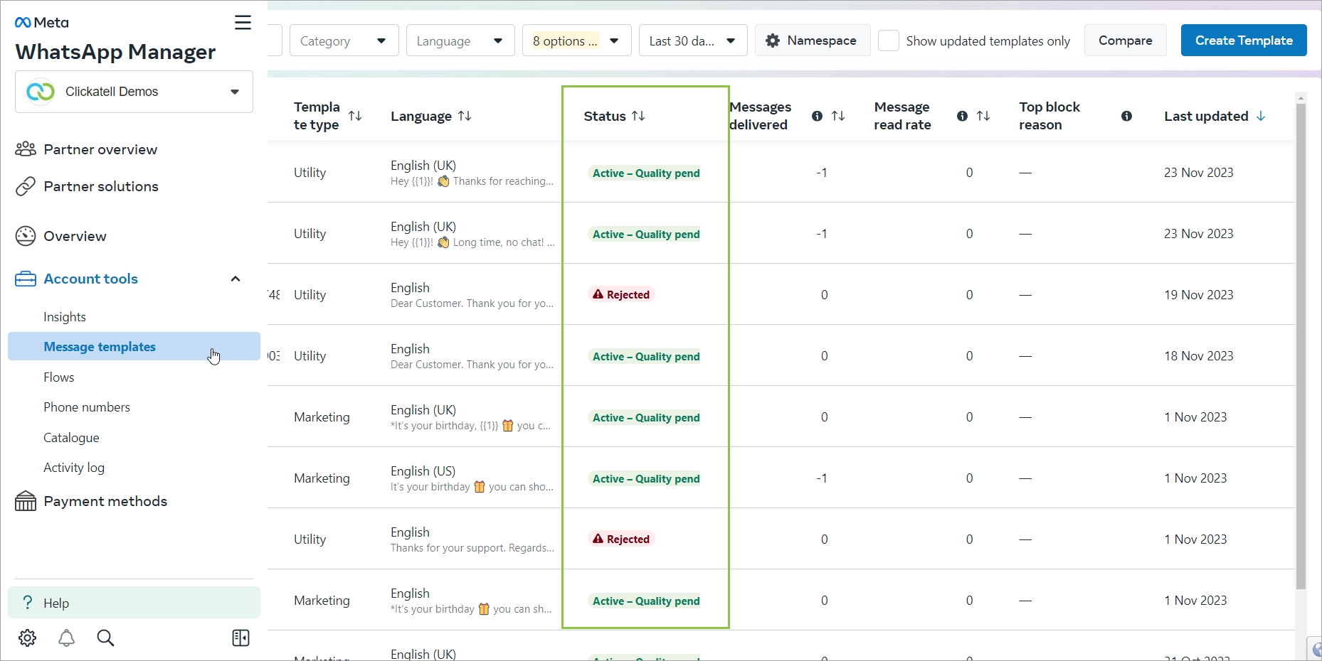 Active - High Quality: The template has received little to no negative customer feedback. Message templates with this status can be sent to customers. See Quality Rating.