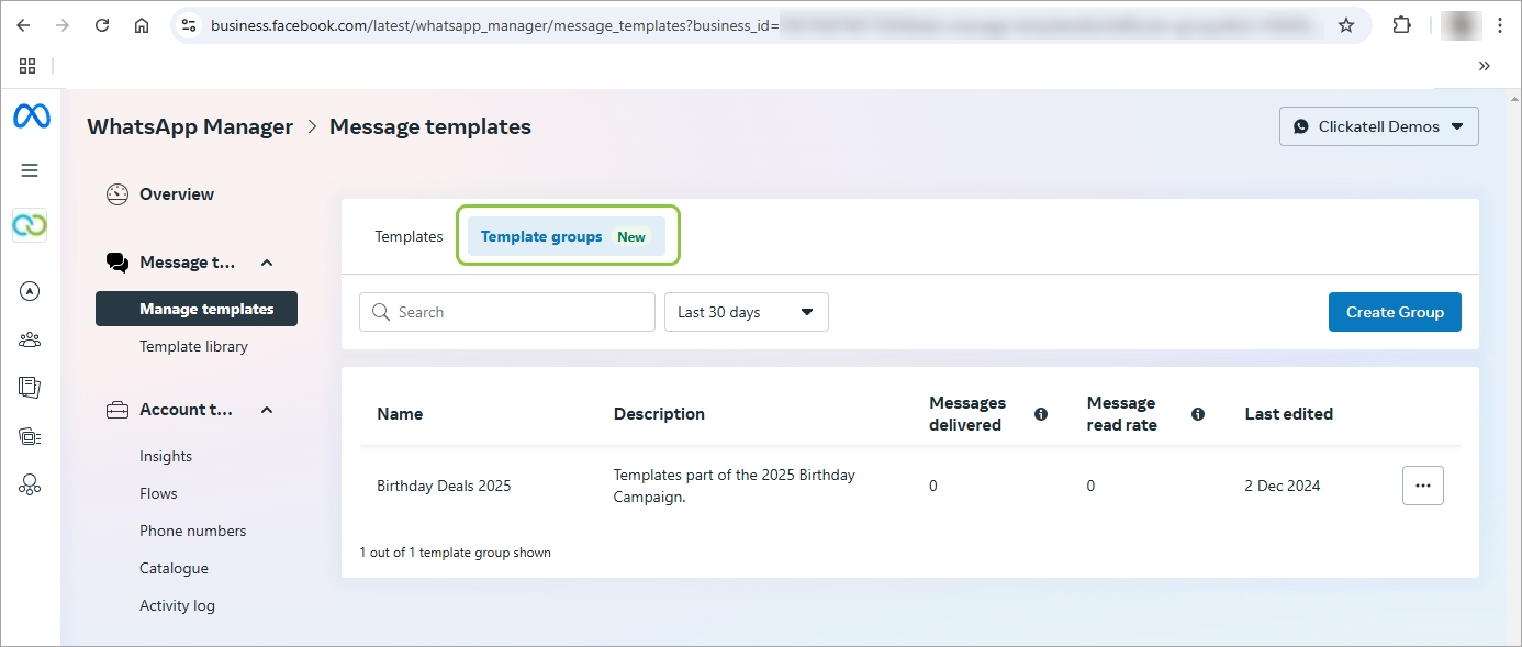 You can consolidate approved templates into groups and track their performance at the group level. Create a template group to monitor data such as cost metrics, engagement rates, and button interactions.
