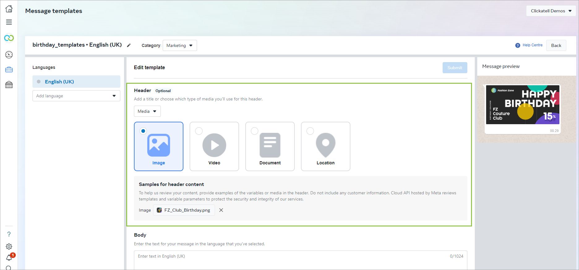 Once your template is approved, upload the media file to be included in your message template onto the Clickatell server by using the Upload media file and Get media file metadata endpoints as described in the One API Reference document.