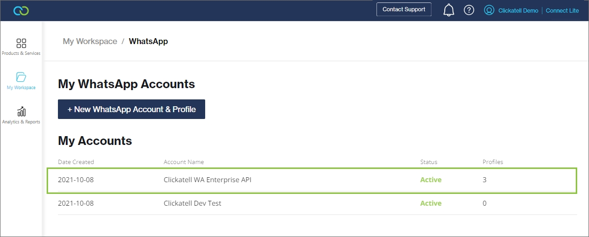 Navigate to My Workspace -> WhatsApp and select the account to which you want to add the new business profile.