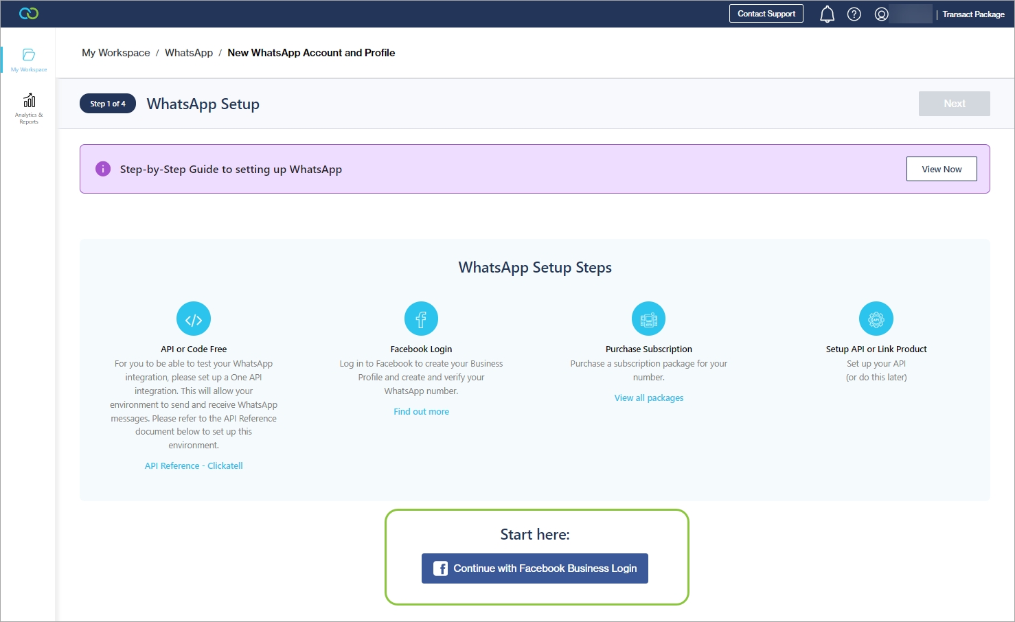 In your Clickatell Portal, navigate to My Workspace -> WhatsApp.