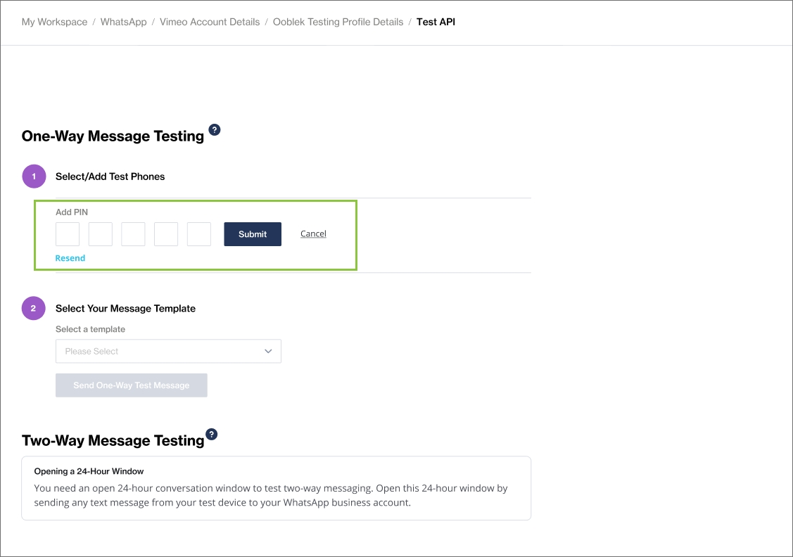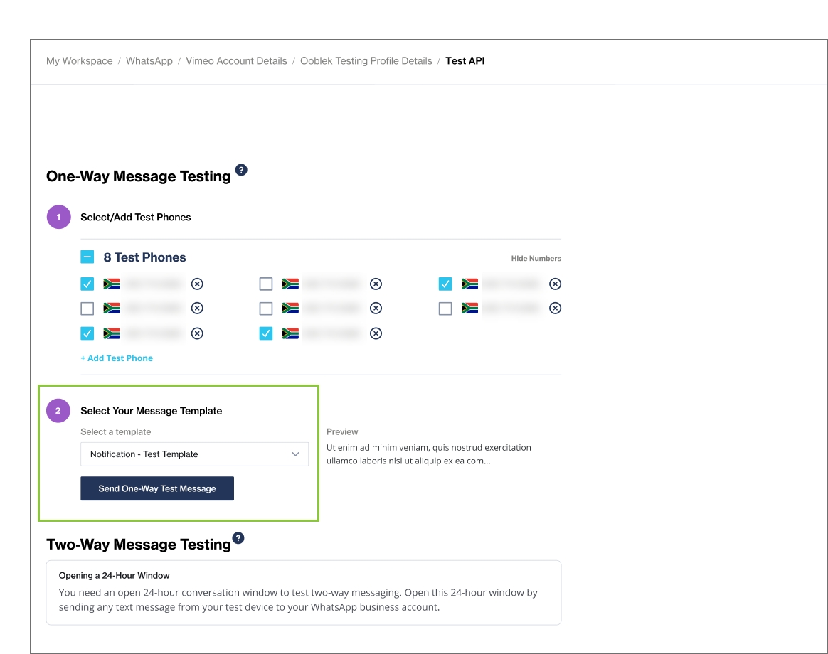 Select one or more of your test numbers, select a template from the drop-down, and click the Send One-Way Test Message button (This test environment only supports text templates. You cannot use templates with headers, footers, media, and buttons).