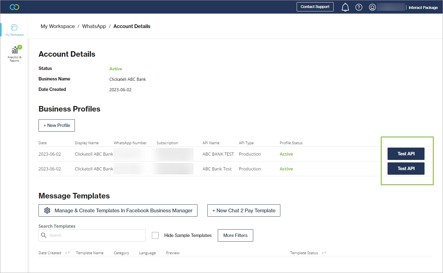 Once your WhatsApp Account and Profile setup is complete and has an "Active" state, you can test your WhatsApp API integration to ensure it is working as expected.