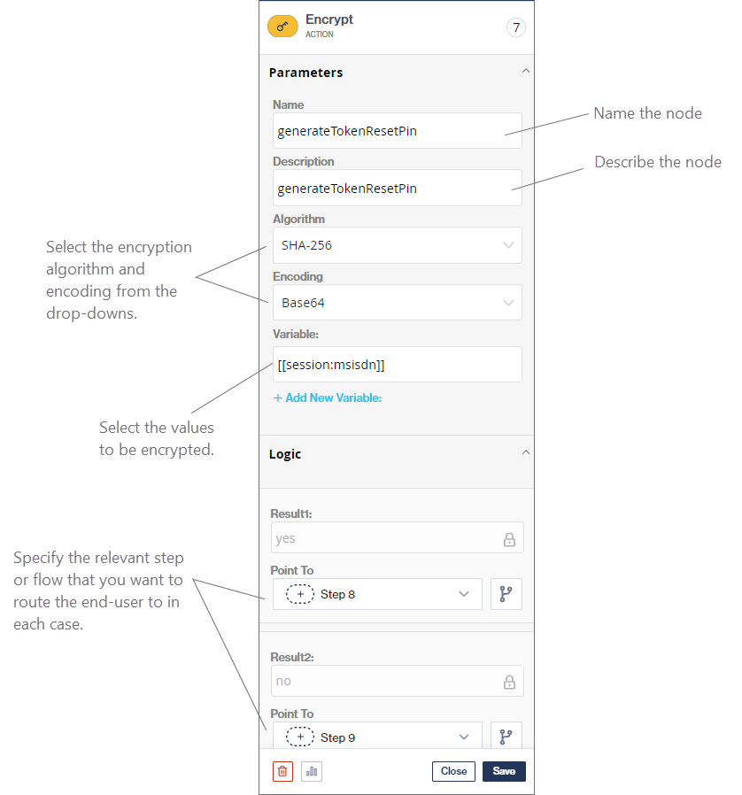 The Encrypt action node allows you to hash, encode or encrypt any variable(s) before sending the variable to an external API.