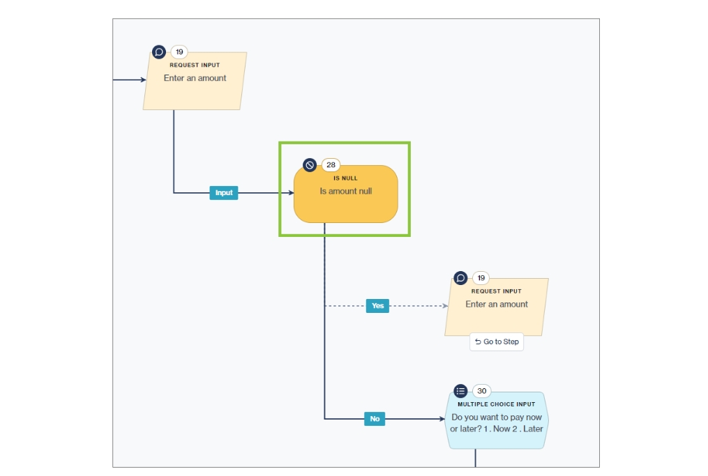 With the Is Null action node, you can verify whether a variable exists (i.e., is it a real value or a NULL value) and define what action follows - either route the customer to a new step in the workflow or trigger a new workflow.
