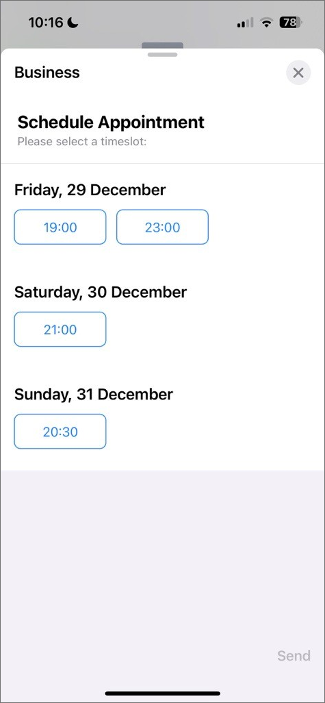 Allow your customers to schedule an appointment. Display available slots to your customers and allow them to pick the one that suits them best. This interactive message also displays conflicts found on the customerβs local calendar to help the customer make a better decision.