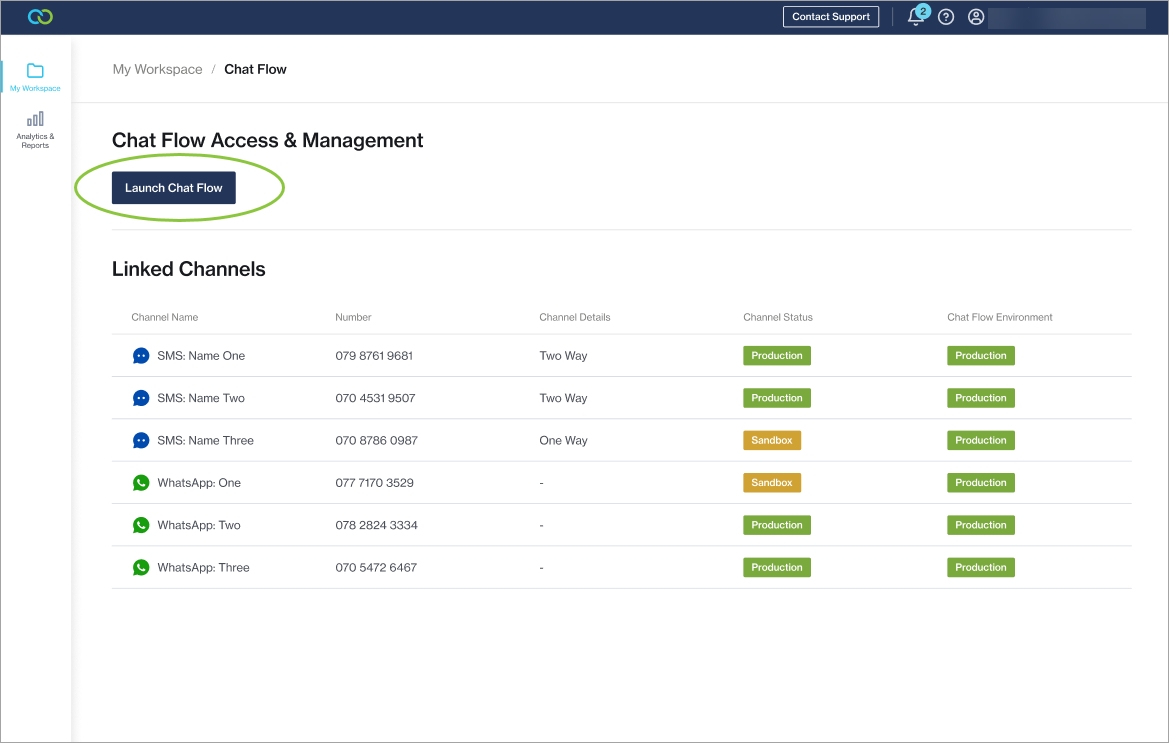 Navigate to My Workspace -> Chat Flow from the Clickatell Portal.