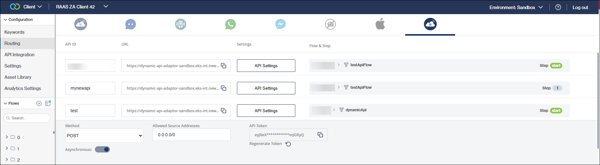 Once the Dynamic API channel is added to the entity a new channel tab will appear under Chat Flow Routing.