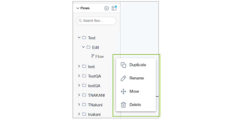 Hover over the relevant flow in the list on the left of your canvas and click the three dots icon to bring up a drop-down: