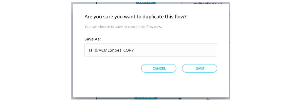 Duplicate: This creates an exact copy of a flow. You can enter a new name for the copy (defaults to the name of the flow you are duplicating appended by "_COPY").
