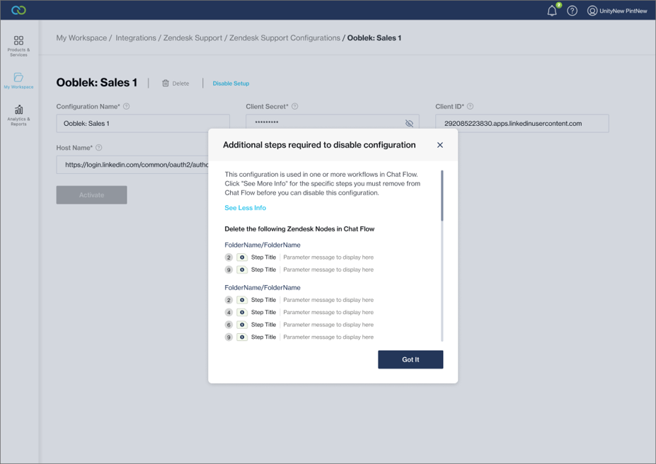 If an integration is used in a workflow in Chat Flow, you are prompted to first remove the integration from all the flows that use it.