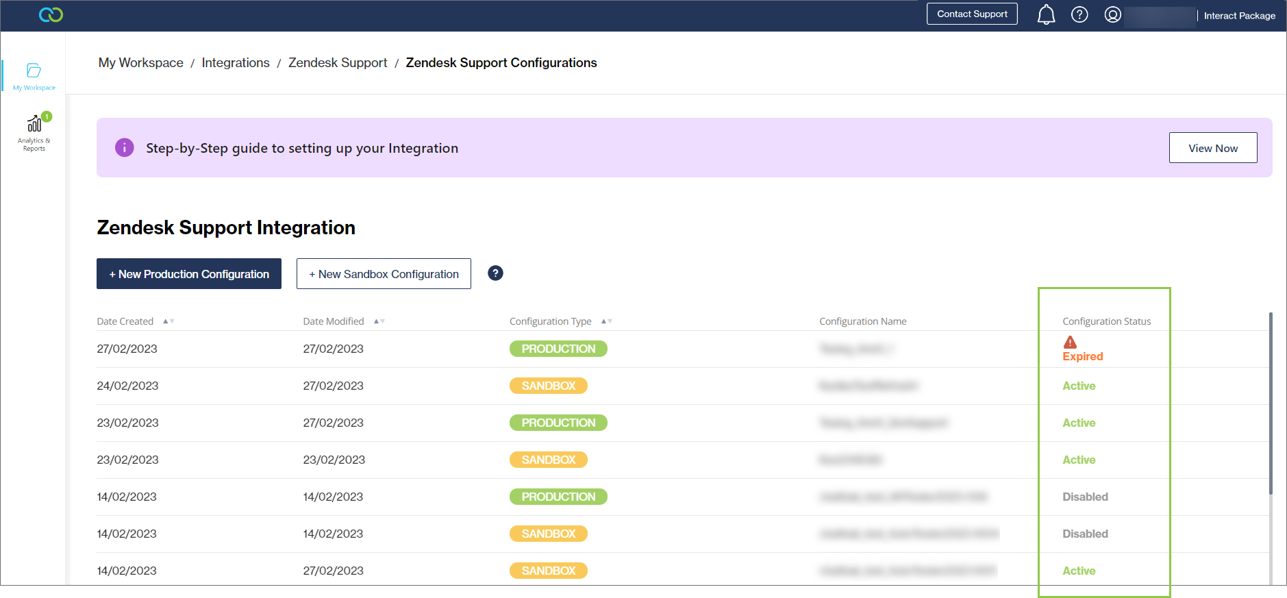 Each integration, whether in Sandbox or Production, can have one of the following statuses: