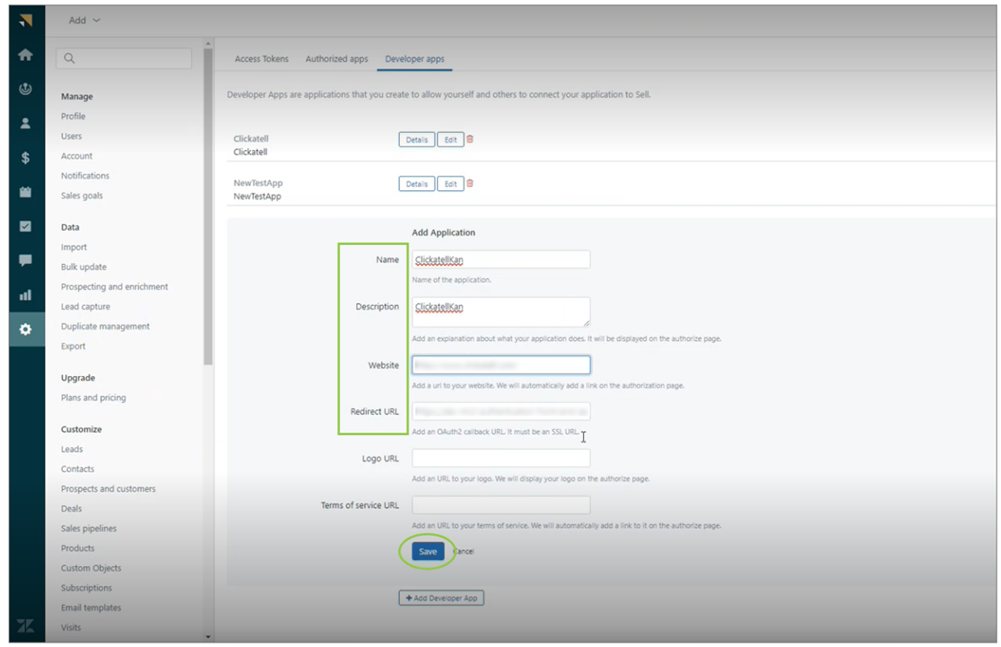 Name: Give a name to your new Developer App in Zendesk Sell.