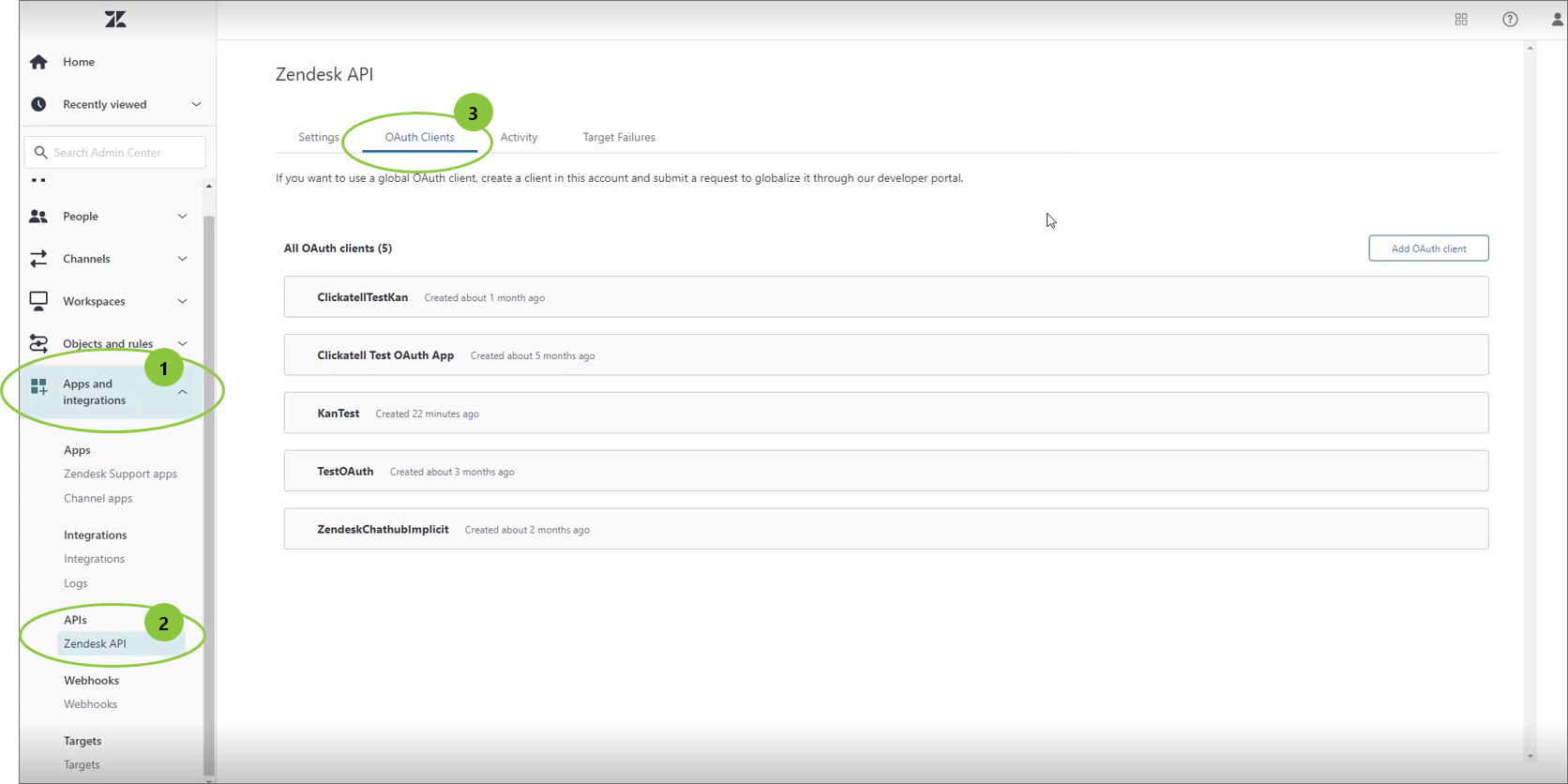 Go to Apps and Integrations -> Zendesk API -> OAuth Clients.