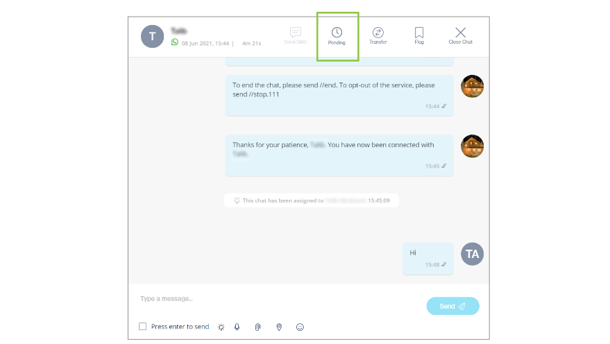 You can now continue engaging with the user from the "Live" tab. In the "Live" tab, the pending icon will not be highlighted anymore, but will still be present on the chat card to show that this chat was marked as pending. The chat will remain in the "Live" tab until you conclude the conversation or move it back to the pending state again.