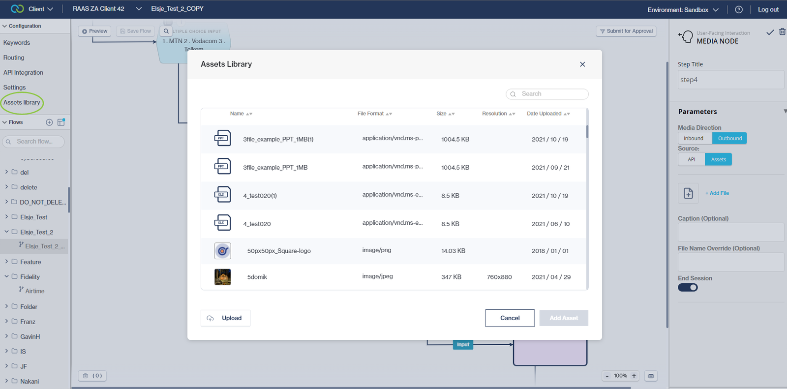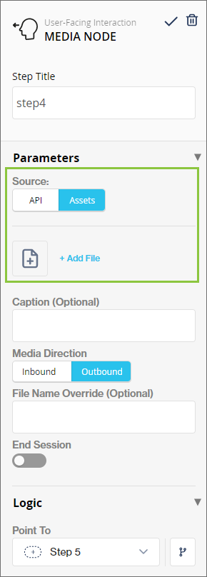 Previously, flow-builders had to configure API calls to fetch media from a hosted location before they could send a media file to their end-users. Enhancements have been made to the[ Media node ](https://clickatell.gitbook.io/flow/user-facing-nodes/display-nodes/user-facing-interactions-media-node)that enables the flow-builder to select the source of the media file they want to send. Flow-builders can still use API calls to fetch media from a hosted location, or they can choose to select media that has been uploaded to the [assets library](https://clickatell.gitbook.io/flow/configuration/manage-your-workflow-assets) to more easily incorporate media into flows and send it to end-users.