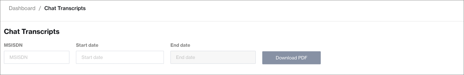 The Download Transcript functionality was re-enabled on Chat Desk. Supervisors can now again download a PDF file containing the chat transcript by date and MSISDN from Dashboard -> Configure- > Download Transcripts.