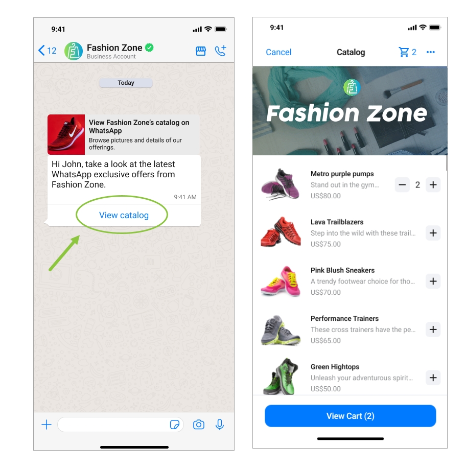 When a customer taps the View catalog button in a catalog template message, your product catalog appears within WhatsApp.